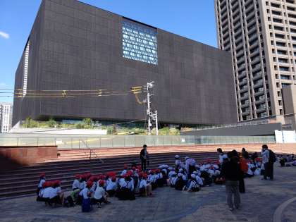 午前の見学が終わり、館前に集合して、お昼ごはんの説明を聞いています。