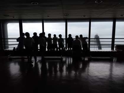 活動の濡れてもよい服に着替え、窓から海を見ています。