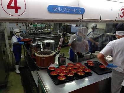 順番に並んで、セルフサービスカウンターで、トレイに夕食をのせてもらいます。