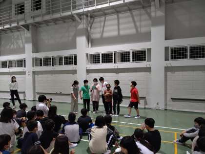 19時からは、体育館で夜の集いが始まっています。伝言ゲームからスタートです。
