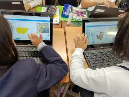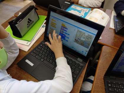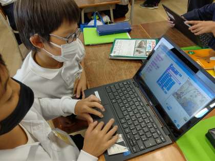 Scratchを使って、人物を動かしたり、セリフを言わせたり、キャラクターやアイテムを追加しています。