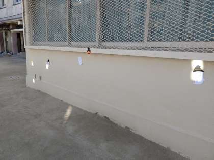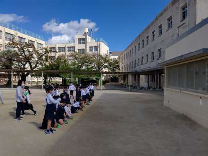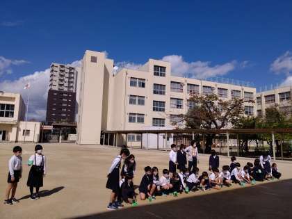 理科で、手鏡を使って、太陽光を反射させて、壁に貼り付けたキャラクターを照らしています。太陽光の直進性の確認をしています。
