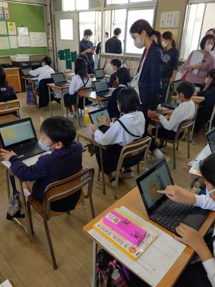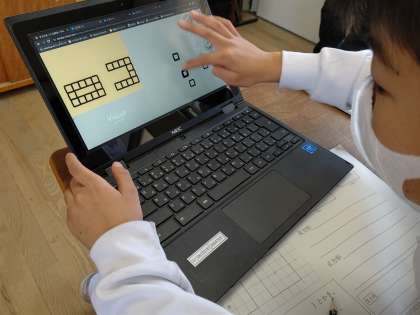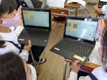 chromebookを使って、Viscuit(プログラミング言語)で四角形を並べ、マスが何個分あるかで面積を比べています。