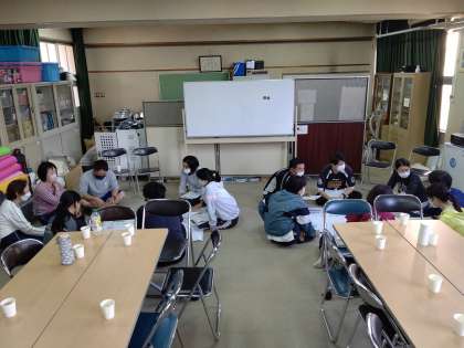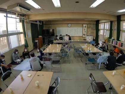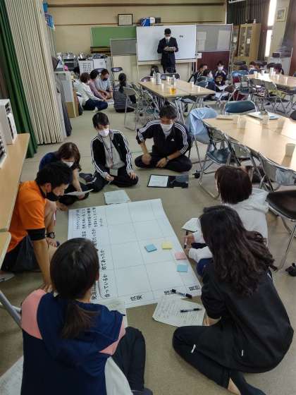 班ごとに分かれて、授業について話し合い、視点別の表に付箋を貼るなどして話し合った内容をまとめました。