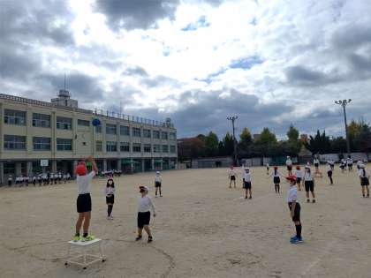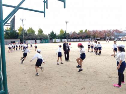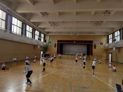 体育館ではなわとび、運動場ではポートボールと大縄跳びを行っています。