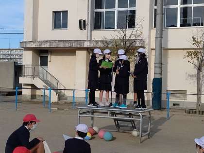集会委員会の児童より、スリーヒントクイズが行われています。