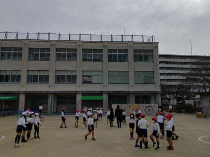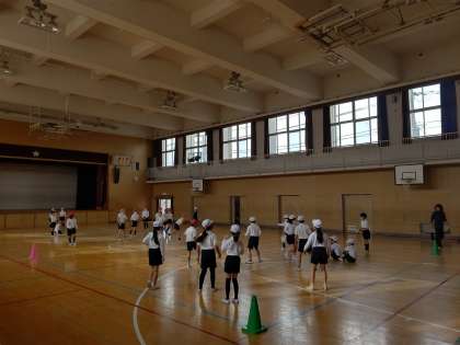 運動場でポートボールトサッカーを、体育館でドッジボールをしています。