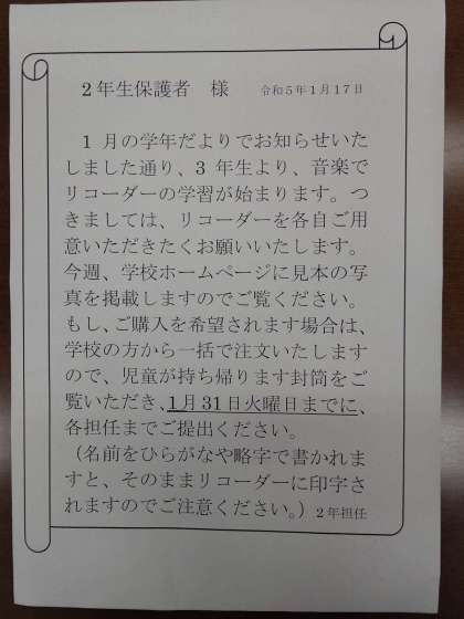 本日2年生の児童に、リコーダーについてのプリントを配布しています。