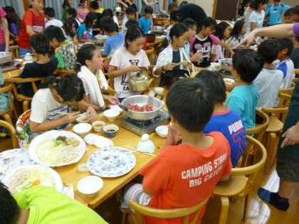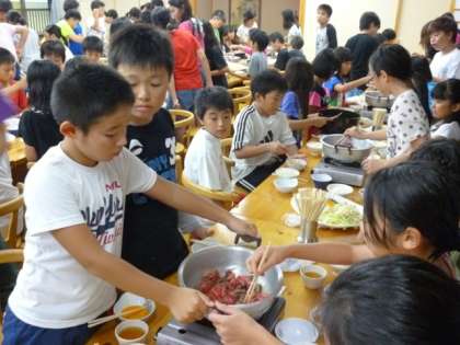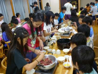 1日目の夕食は「すき焼き」です。肉を炒めた後は、全ての具材をドバっと投入。あっという間に平らげていました。
