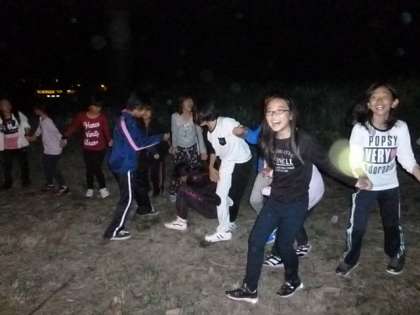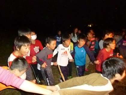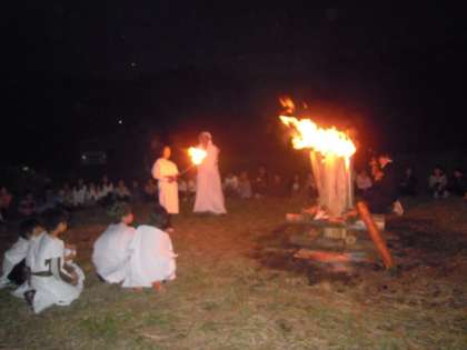 先ずは火の神様の登場で点火、フォークダンスでキャンプファイアが始まりました。