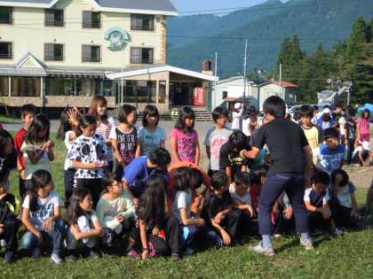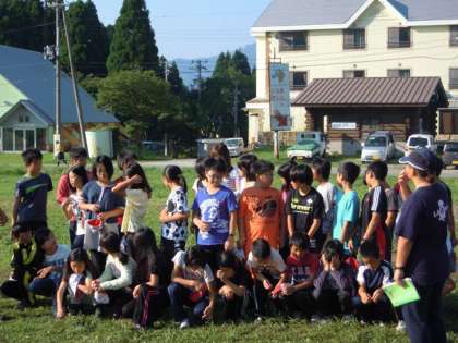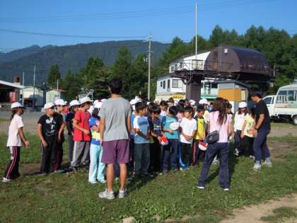●朝の集いの後、宿舎をバックに「クラス写真」撮影
