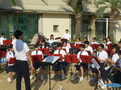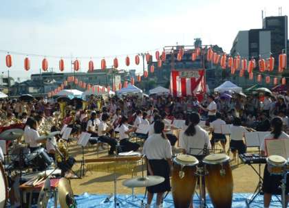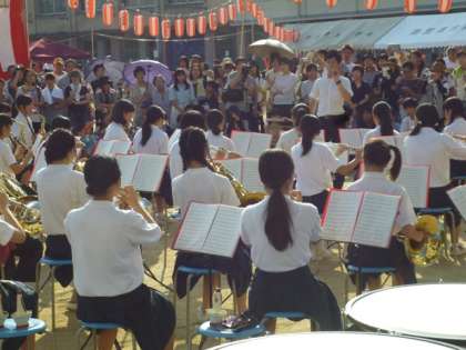 ●まだまだ暑い中、東淀中学校の「吹奏楽部」。各種大会で好評価を得ているだけあってさすがの演奏に来場者は釘づけでした。