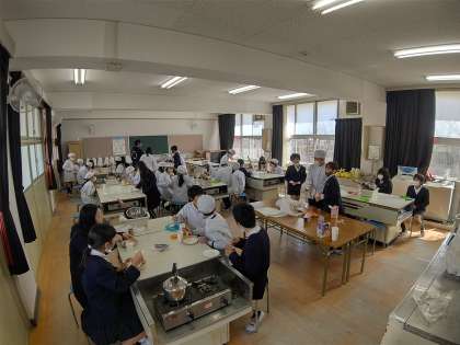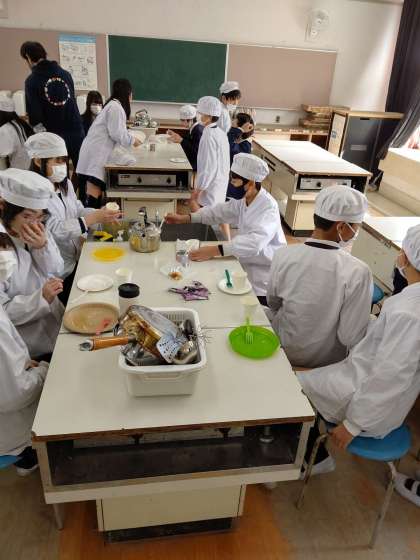 家庭科の調理実習で、ホットケーキを作っています。