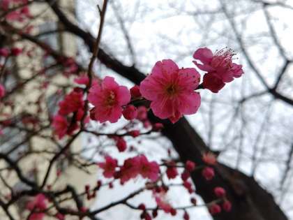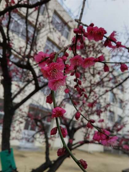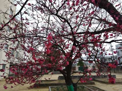 雪が舞う中、校庭の梅の花が咲き始めています。