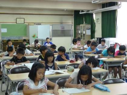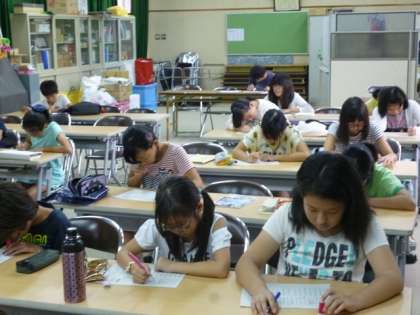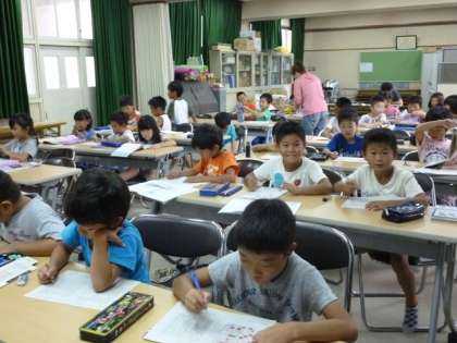 今日は「漢字検定試験」の問題に挑戦。会場の多目的教室はたくさんの児童で熱気ムンムンでした。