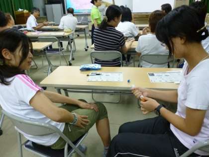 参加している全教職員が実際に、針のない「エピペン」の練習機器を使い、自分とペアの先生に打ってみました。