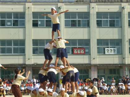 本校でも、運動会6年生の団体演技のメインは「組体操」。