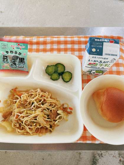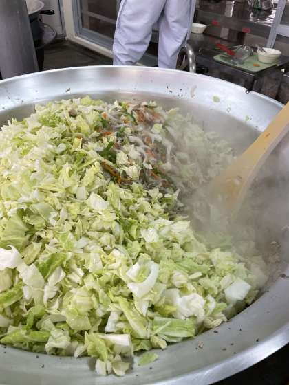今日の給食は、野菜たっぷりの焼きそばでした。豊里小学校では、大きな二つの釜で豚肉、野菜を炒め、塩、こしょう、とんかつソース、ウスターソースで味付けて麺を加えて更に炒めて作っています。