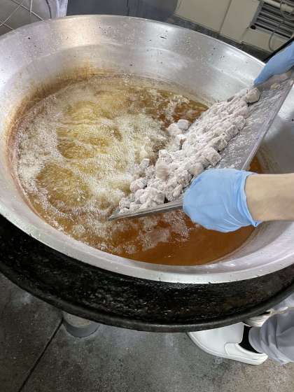 まぐろをしょうが汁、料理酒で下味をつけ、でんぷんをまぶし、熱した油で揚げます。