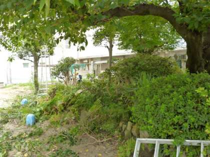 「チャドクガ」の心配のあるツバキ周辺は、念には念をいれバーナーでもやし、たとえ少しでもその毒で子ども達が被害に合わないように作業中です。