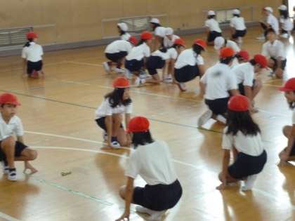 突然降り出した雨で通路待機の6年生をしり目に、5年生の団体演技。