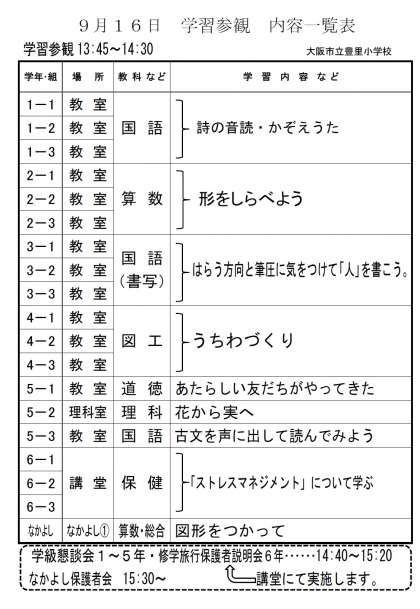 なお、学習参観の後、1年から5年は学級懇談会、6年は修学旅行説明会予定していますので、奮ってご参加下さい。