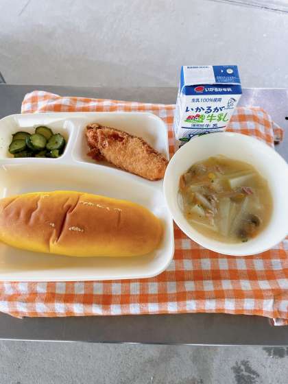 今日は、豆乳スープでした。豆乳は、大豆から作られます。主に体をつくるもとになる赤のグループの食べ物で、タンパク質がたくさん含まれています。