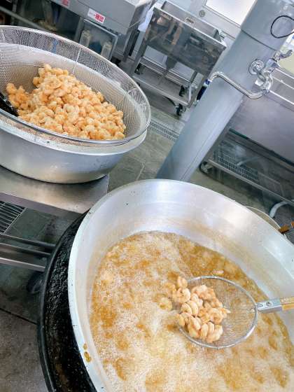 合わせて煮、配缶時にえびにからませて作ります。カラッとあがったえびにチリソースがうまくからんで大好評でした♪