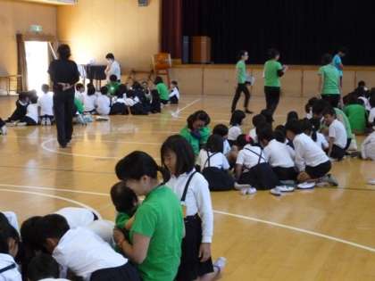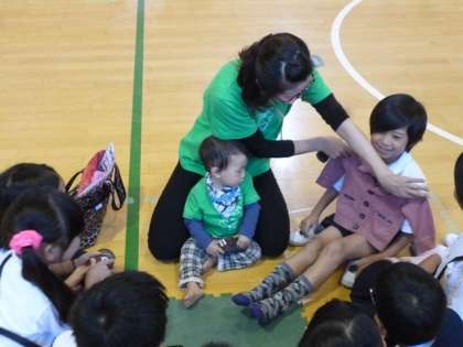 赤ちゃんを抱いたことのない児童は、おっかなびっくり。でも、屈託のない赤ちゃんの反応にすぐに打ち解け、キラキラと目を輝かせていました。