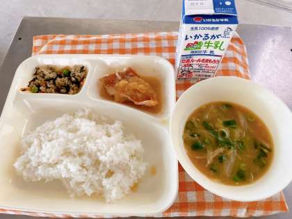 今日の高野豆腐は、粉末状にしたものを使用しています。油を熱して、豚ひき肉を炒め、さらににんじん、ひじきの順に炒め、出汁を加えて煮る。煮あがれば、砂糖、塩、うすくち醤油で味付けしてグリンピースを加えて煮、高野豆腐を一度に加えて煮て作ります。