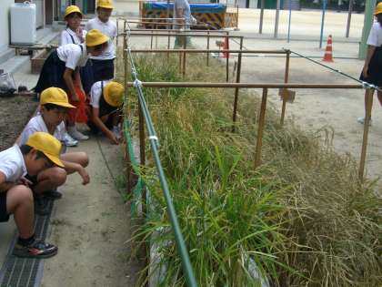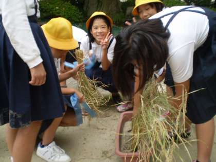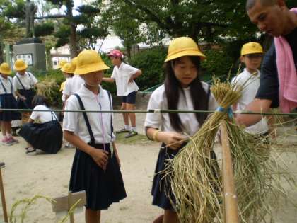 5年生は理科の学習の一環として水稲栽培をしました。10月に入り稲が実ってきたので稲刈りをしました。慣れない手さばきで鎌を使い、苦労して稲を刈る経験は、普段当たり前に食べているお米を育てることの大変さに思いをはせる良い経験になったと思います。〜実るほど 頭を垂れる 稲穂かな〜 (教務)