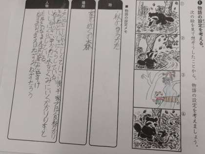 3年生の国語の時間は教科書の絵と、自分で考えた絵をもとに物語を書いて発表をしあいました。