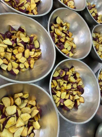 さつまいもは、1600年ごろに中国から日本の琉球(今の沖縄県)を通って、薩摩藩(今の鹿児島県)に伝わりました。薩摩藩でたくさん作られたことから「さつまいも」と呼ばれるようになりました。主な成分は、でんぷんですが、ビタミンCや食物繊維も多く含まれています。