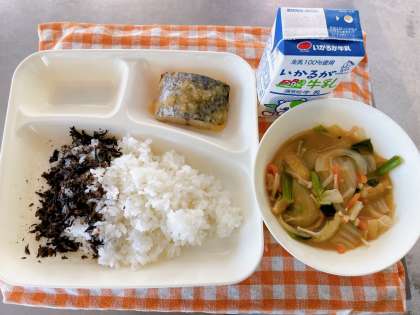 牛ひじきそぼろは、牛ひき肉とひじきをいため、甘辛く味付けし、しそを加えて風味を増しています。しその香りには、食欲を増す働きがあります。ひじきとしそを使うことでカルシウムや食物せんいを取ることができます。ご飯にひじきそぼろをかけることでご飯が進む献立でした。