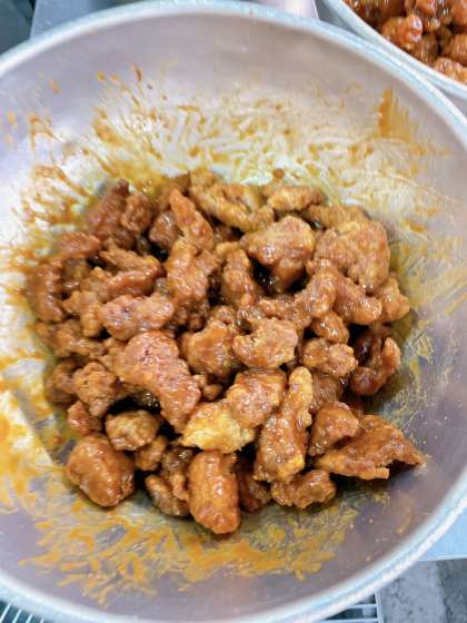 八丁味噌、赤みそ、砂糖、みりんに湯を少しずつ加えて煮、水溶きでんぷんでとろみをつけ、配缶時にカツにかけて作ります。どのクラスも大好評でした。