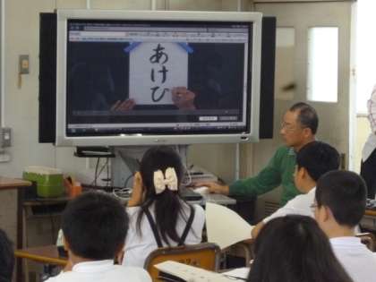 多目的室から大型テレビを運び、映像を使って筆の運びの説明。子ども達は興味津々です。今日のポイントは、「穂先の動きと点画のつながり」。柔らかい曲線のつながりに注目です。