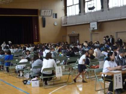 1時前には早くも長い行列、定時には会場の体育館はほぼいっぱいでした。