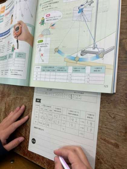 角度を変えたり、おもりをつなぐ糸を長くしたりして、ふれ幅や時間を調べていました。