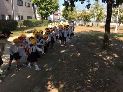 今日、1年生が生活科の学習で中央公園へ公園たんけんに行きました。