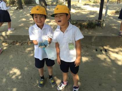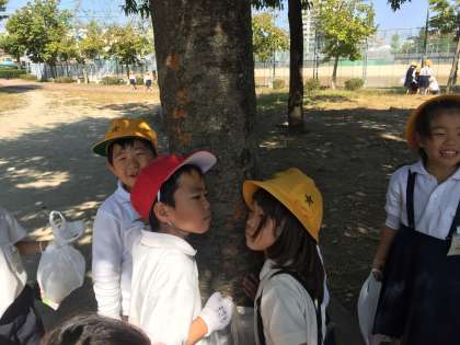 公園たんけんで子ども達が楽しげに学習していたので、写真をたくさん撮ってしましました。木に耳を当てて水が流れる音を確かめている様子…ほほえましいですね。(教務)