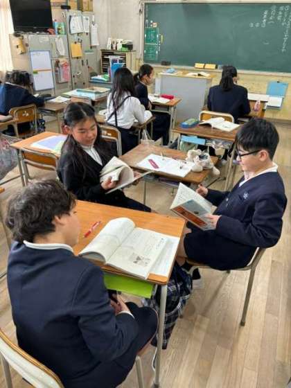 国語科『古文のえがく四季』の学習の様子です。清少納言の枕草子の書きだしを参考に、自分たちが感じる季節の良さを発表し合いました。