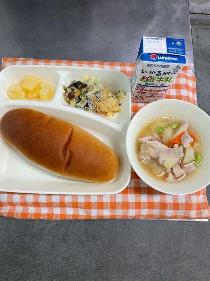 ホタテ貝のグラタンは、玉ねぎ、ほうれん草、マカロニでクリーミーなホワイトソース味で焦げ目を焼き物機でつけて香ばしく焼き上げて作りました。どのクラスも大好評でした。