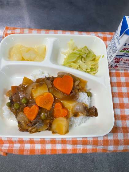 今日のハヤシライスにバレンタインのハート型ラッキーにんじんが入ってました。