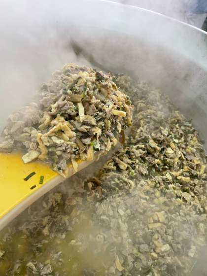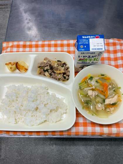干しずいきは、里芋の葉と茎をつないでいる部分を呼びます。干しずいきは、ずいきの皮をむいて、水にさらした後、乾燥させたものです。食物せんいやカルシウム、鉄を多く含んでいます。今日は、そのずいきを豚肉と炒めて砂糖、みりん、こいくちしゅうゆ、あかみそで味付けして煮ふくめ、最後に青ネギを加えて煮て作ります。一年生は、初めてのずいきでしたが美味しいと言って食べていました。