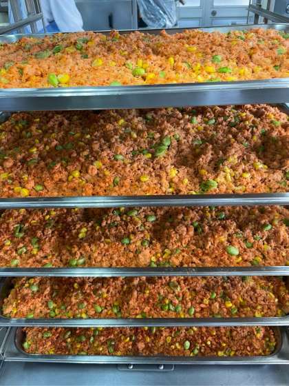 今日は、卒業祝い献立でした。焼き海苔にごはんをのせ、牛肉のコチジャン炒めと鮭のカラフルそぼろをのせて食べました。