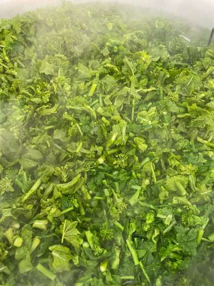 菜の花は、「なばな」や「はなな」とも呼ばれます。春が旬の野菜です。皮膚やのど、鼻の粘膜を強くするカロテンを多く含んでいます。白菜と菜の花を茹でてダシと砂糖、うすくちしょうゆで味付けして作ります。ほろ苦いですが好きな子どもは、お代わりをしていました。