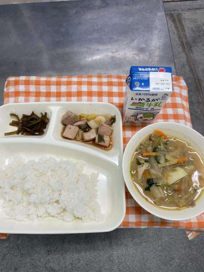 茎わかめは、わかめの葉の芯の部分で、コリコリした歯ごたえが特徴です。骨や歯を丈夫にするカルシウム、おなかの調子を整える食物繊維などが多く含まれています。だしで煮て、砂糖、みりん、こいくちしょうゆで味付けして煮詰めて作りました。マグロの甘辛焼き、豚汁もごはんがすすむ献立で好評でした。