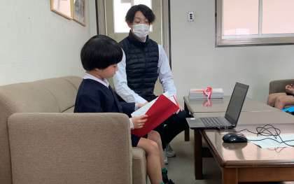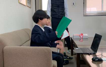 1年生の代表の児童が「楽しかった1年間の思い出」の作文を読んでいる様子です。