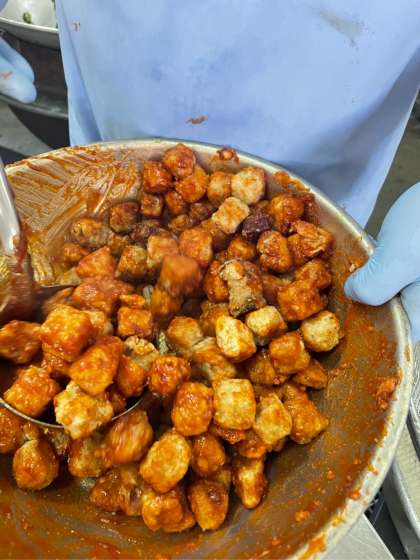 3.ケチャップ、砂糖、赤みそで作ったタレを揚げたまぐろにからませる。
