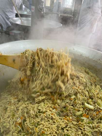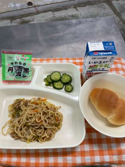 焼きそばは、豚肉、にんじん、玉ねぎ、ピーマン、キャベツを炒め、塩、こしょう、トンカツソース、ウスターソースで味付けして茹でた中華麺を加えて炒めて作ります。豊里小学校は、700食の焼きそばを2釜に分けて炒めます。